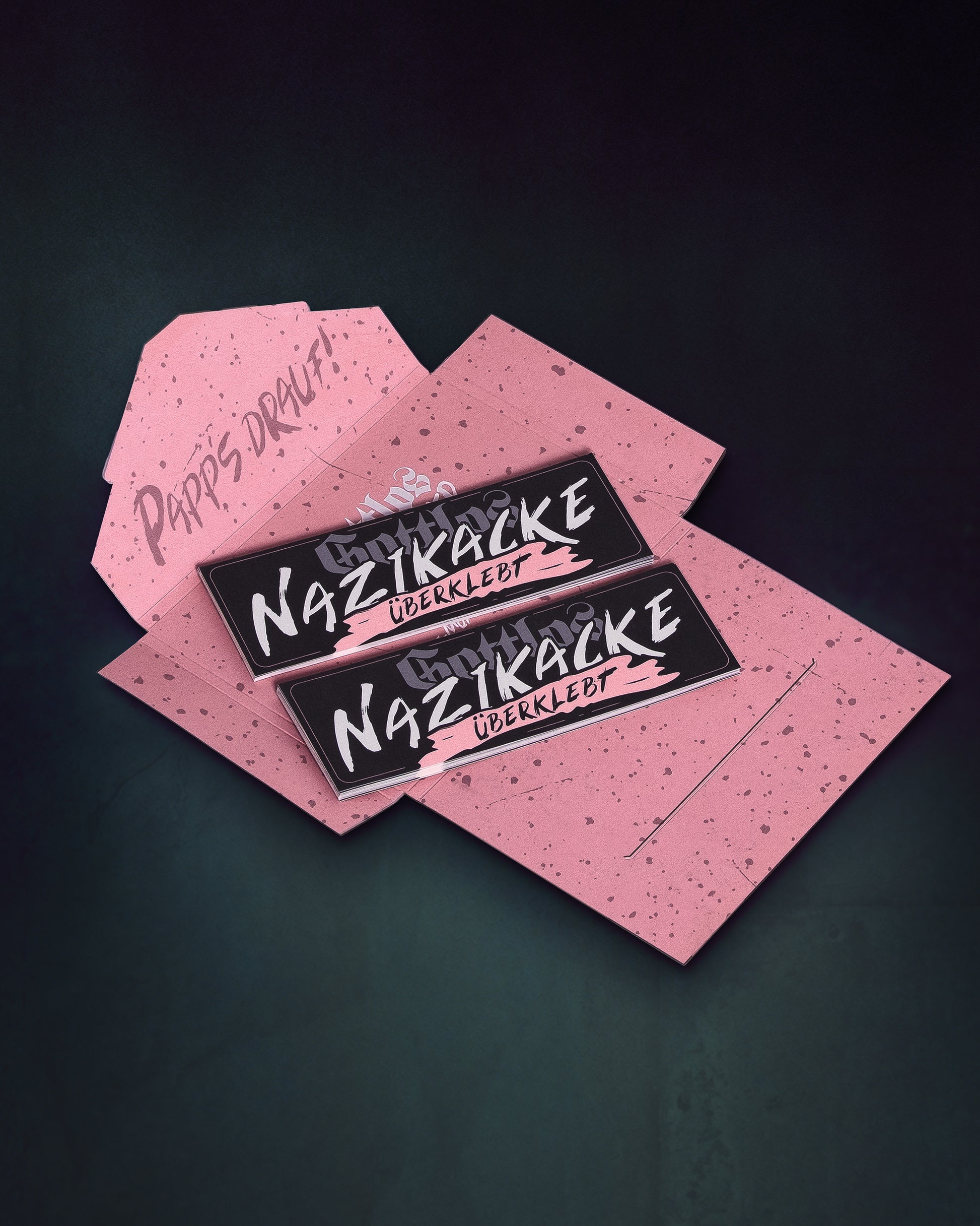 30+ Sticker mit der Aufschrift: "Gottlos Nazikacke überklebt" in einer praktischen Box.